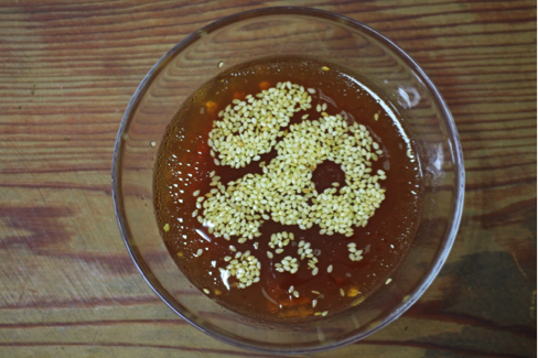 清水250cc,放入原味國寶茶包1包煮沸騰(再浸泡一分鐘)就可撈出放涼,再放入味醂,香油,水果醋,白芝麻,攪拌均勻,即成沾汁,備用。