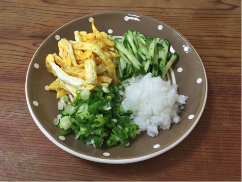 白蘿蔔削皮磨泥、青蔥切細、小黃瓜刨絲,煎蛋絲備用。