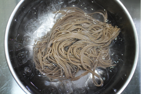 2.將麵條放入滾開的熱水中,待 5 分鐘後,將麵條撈起,過冰水冰鎮, 備用。