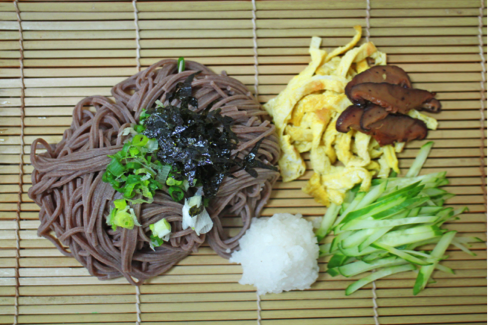 4.將麵放上盤子,麵上擺碎蔥及海苔絲,麵旁擺上山葵醬,蘿蔔泥,小黃瓜絲。將醬汁盛裝於沾麵碗中,即可食用。